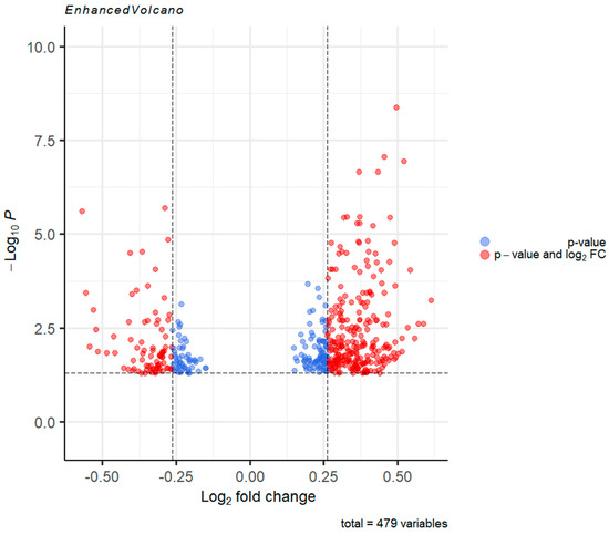 Volcano plot representing the statistically significant DEGs. Genes below the p-value cut-off were omitted from the plot. Genes which displayed fold change <1.2 are colored blue. Genes with fold change ≥1.2 are shown in red. Data plotted using the EnhancedVolcano software package Bioconductor version: Release (3.12). R package version 1.8.0. R version 4.0.3.