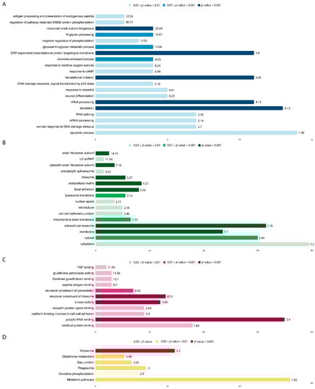 Upregulated GO groups by biological processes (A); Upregulated GO groups by cellular components (B); Upregulated GO groups by molecular function (C); Upregulated gene groups by KEGG (D). Labels for each GO group are plotted on the y-axis, the number of genes present within the GO group—on the x-axis. Fold enrichment scores for the corresponding GO groups are presented at the end of each bar. Results within a given plot are color-coded by p-value.