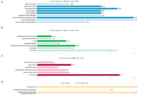 Groups containing downregulated genes associated with biological processes (Figure 6A) included the following: GO:0007584~response to nutrient (4 genes: HMGCR—3-Hydroxy-3-Methylglutaryl-CoA Reductase, SLC8A1—Sodium/Calcium Exchanger, ACSL3—Acyl-CoA Synthetase Long Chain Family Member 3, CNR1—Cannabinoid Receptor 1; p = 0.0032, Fold Enrichment = 13.35); GO:0043065~positive regulation of apoptotic process (6 genes: ARHGEF12—Rho Guanine Nucleotide Exchange Factor 12, CSRNP3—Cysteine And Serine Rich Nuclear Protein 3, KALRN—Kalirin RhoGEF Kinase, PRKDC—DNA-Dependent Protein Kinase Catalytic Subunit, TXNIP—Thioredoxin Interacting Protein, CNR1; p = 0.007, Fold Enrichment = 4.94); GO:0007420~brain development (5 genes: BMPR2—Bone Morphogenetic Protein Receptor Type 2, ATP2B1—ATPase Plasma Membrane Ca2+ Transporting 1, ACSL3, PRKDC, ROBO2—Roundabout Guidance Receptor 2; p = 0.00745, Fold Enrichment = 9.877); GO:0016310~phosphorylation (4 genes: PPIP5K2—Diphosphoinositol Pentakisphosphate Kinase 2, PANK3—Pantothenate Kinase 3, ETNK1—Ethanolamine Kinase 1, N4BP2—NEDD4 Binding Protein 2; p = 0.0074, Fold Enrichment = 9.877); GO:0001764~neuron migration (4 genes: PCM1—Pericentriolar Material 1 Protein, DCC—Netrin 1 Receptor, FZD3—Frizzled Class Receptor 3, DCX—Doublecortin; p = 0.0085, Fold Enrichment = 9.4); GO:1901660~calcium ion export (2 genes: ATP2B1, SLC8A1; p = 0.012, Fold Enrichment = 164.63); GO:0006468~protein phosphorylation (6 genes: BIRC6—BIR Repeat-Containing Ubiquitin-Conjugating Enzyme, SCYL2—SCY1 Like Pseudokinase 2, GMFB—Glia Maturation Factor Beta, SNRK—SNF Related Kinase, KALRN, PIK3C3—Phosphatidylinositol 3-Kinase Catalytic Subunit Type 3; p = 0.035, Fold Enrichment = 3.25); GO:0042127~regulation of cell proliferation (4 genes: BMPR2, BIRC6, TFRC—Transferrin Receptor, TXNIP; p = 0.038, Fold Enrichment = 5.34); GO:0008286~insulin receptor signaling pathway (3 genes: SOGA1—Suppressor Of Glucose, Autophagy Associated 1, PIK3R3—Phosphoinositide-3-Kinase Regulatory Subunit 3, PHIP—Pleckstrin Homology Domain Interacting Protein; p = 0.039, Fold Enrichment = 9.5). The full list of genes and GO groups can be found in Supplementary Table S5.