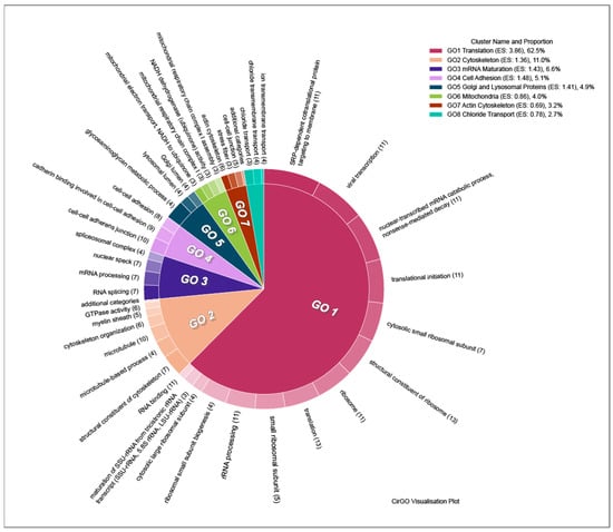 Using DAVID clusterization, groups of DEGs were sorted into eight clusters for upregulated genes, and five clusters for downregulated genes. The most representative cluster for the upregulated genes is the ribosome-associated translation cluster, which includes genes from both ribosomal elements and the translation process as a whole (Enrichment Score: 3.86). This cluster includes 14 groups of genes. Genes associated with microtubule cytoskeleton organization, especially that of tubulin, were also found to be upregulated. This cluster includes six gene groups (Enrichment Score: 1.36). Upregulated genes were also sorted into clusters associated with cellular adhesion (Enrichment Score: 1.48), mRNA maturation (Enrichment Score: 1.43), Cl− transport through the membrane (Enrichment Score: 0.78), mitochondria (Enrichment Score: 0.86), and Golgi and lysosomal proteins (Enrichment Score: 1.41) (Figure 7). The complete list of clusters and groups of genes included in them can be found in Supplementary materials, sheet “DOWNreg Clusters”.