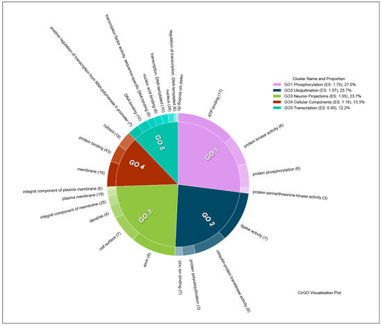 Due to the smaller number of downregulated genes, clusterization analysis was less informative than that for the upregulated genes. Downregulated genes were sorted into five clusters. These included clusters represented by genes associated with phosphorylation (Enrichment Score: 1.79), and ubiquitination (Enrichment Score: 1.57), neuron projections (Enrichment Score: 1.05), miscellaneous cellular components (Enrichment Score: 1.18), and transcription (Enrichment Score: 0.40) (Figure 8). The full list of clusters and included gene groups can be found in Supplementary materials, sheet “UPreg Clusters”.