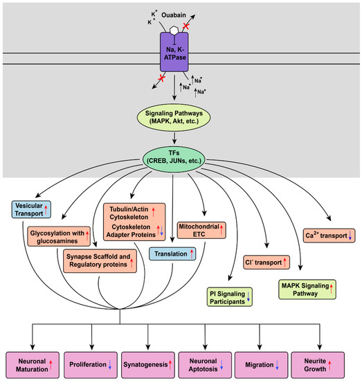 Diagram of the main processes induced by 16-h incubation of human iPSC-derived expressing DARPP-32 and GABA receptors neurons expressing DARPP-32 with 30 nM ouabain. Kinases and signaling pathways colored light green, transcription factors (TF) colored green. Cellular components and specific processes colored orange. Biological processes colored light purple. Up and down arrows signify increased and decreased gene expression, respectively.