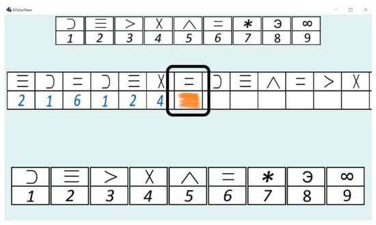 In the present study, the computerised version of the DSST test [50,51] was applied. A subject was asked to match symbols to numbers according to a key located at the bottom of the screen. To assign a particular symbol, a subject had to click on the key corresponding to this symbol. A graphical frame (Figure 1) marked the currently active letter, and after assigning a symbol, the frame moved to the next letter. The subject matched symbols to subsequent letters within the specified time. Subsequent letters were generated randomly and with repetition, and they appeared continuously within the defined time.