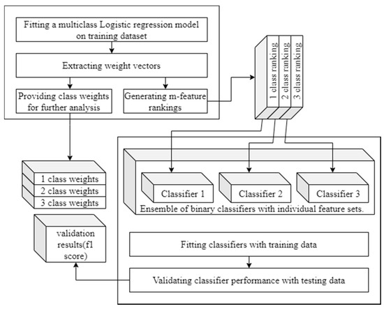 , is the value of -th feature.The values of weights {}, representing feature importance, are obtained in the process of model training. Hence, training a logistic regression model on the complete feature set is a starting point for feature selection. Figure 3 presents the process of feature selection and appliance of its results in classification. The logistic regression models applied for feature selection include also regularisation elements; after initial consideration, elastic net, being the linear combination of L1 and L2 regularisation, was applied. The approach allowed mitigating possible correlations between features, so that in a pair of correlated features, one obtained a higher importance weight and the other was assigned a notably lower weight.