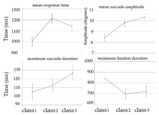 The statistical analysis was based on the ANOVA procedure. Statistically significant differences for all classes were revealed for the maximum saccade amplitude feature, but the difference was observed only in the following pairs: class 1 and class 3, class 2 and class 3. The most significant differences were observed between class 1, which corresponds to a low cognitive workload level, and class 3, which is related to a high cognitive workload level, as they are the farthest from each other. However, the differences between average values of the mean response time feature was calculated for class 1 and class 2 but not for class 1 and class 3. It could be explained by the fact that the participants had been better acquainted with the application, so they answered questions faster, despite the fact that the third part of the experiment was more difficult. Presumably, there is no statistical significant difference between class 2 and class 3 for mean response time because the second and third part of the experiment included the same number of elements. What is more, a statistically significant difference has been found only for the maximum saccade amplitude feature between class 2 and class 3. This might be explained by the fact that the third part is the most advanced, and then, the participant saccades had the highest amplitude.