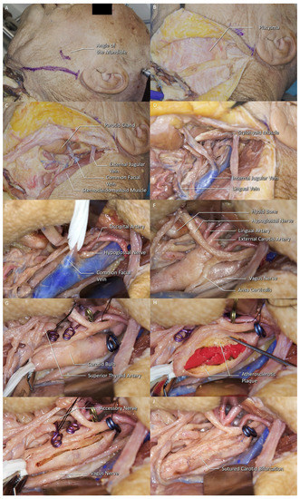 44 sides of the 22 formalin-fixed cadaveric heads were prepared for anatomical dissection at the Department of Neurosurgery, “Center for Advanced Simulation and Education (CASE), Neuroanatomy Lab” at Acibadem MAA University. Stratigraphic anatomical dissections were carried out, following the classical carotid endarterectomy procedure, and results were photographed at every step of the procedure (Figure 1).