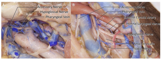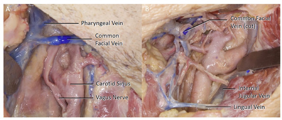 The pharyngeal vein collects the venous blood of the pharynx and drains into the IJV (Figure 3C). A pharyngeal vein was identified in 50% of the sides. In two sides, the pharyngeal vein was the only branch of the IJV at the surgical area (Figure 3C). In two sides, there were multiple pharyngeal veins draining into the IJV (Figure 4A,B).
