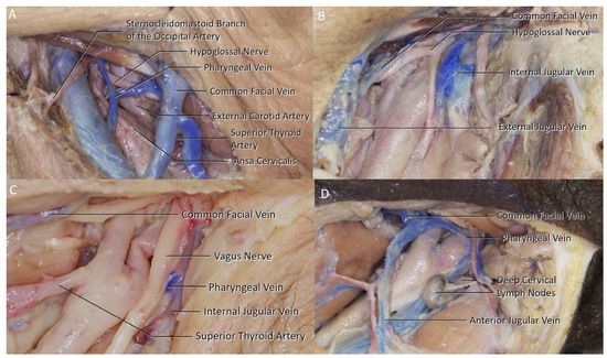 The common facial vein is formed by the union of the anterior facial vein and the posterior division of the retromandibular vein leaving the parotid gland. The anterior facial vein is the extent of the angular vein formed by the supratrochlear and the supraorbital veins. The retromandibular vein on the other hand is formed by the superficial temporal veins and the retromandibular vein. The remaining posterior division of the retromandibular vein does not drain into the IJV and continues as the external jugular vein after joining with the posterior auricular vein. The common facial vein was identified in 86.4% of the sides. In 20 sides (45.5%), the common facial had an accompanying branch draining into the IJV (Figure 3A). No common facial vein was identified within the surgical field in six sides (13.6%). The common facial vein was draining into the external jugular vein (EJV) (Figure 3B,C) in two sides. Additionally, a connecting vein was identified between the common facial vein and the anterior jugular vein (Figure 3D) in two sides.