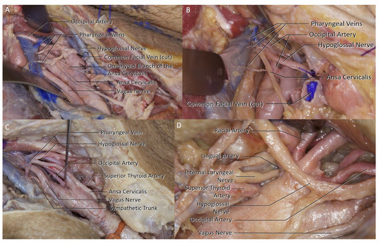 The HN was observed at levels varying between the anterior belly of the digastric muscle to as low as the carotid bifurcation where it would require mobilization to gain access to the carotid bulb. A HN was identified in all but four sides. In those four sides, the HN was considered to make its horizontal turn more superiorly; therefore, not entering the surgical field of view. 16 of the 44 sides had the HN in proximity of the surgical path (36.7%). Four of the hypoglossal nerves required extensive mobilization possibly with an ansa cervicalis superior branch sacrifice (Figure 4A,D). It can be divided to release the HN without introducing major functional or cosmetic consequences [5]. The superior root of the ansa cervicalis was identified within the surgical area in 28 of the 44 sides (63.6%). In two sides, the omohyoid branch could be observed, leaving the superior branch, inferior to the hypoglossal nerve-ansa cervicalis bifurcation (Figure 4A). Although it has been shown in the literature that variations of the superior branch are rarer than the inferior branch, such variations are possible [6].