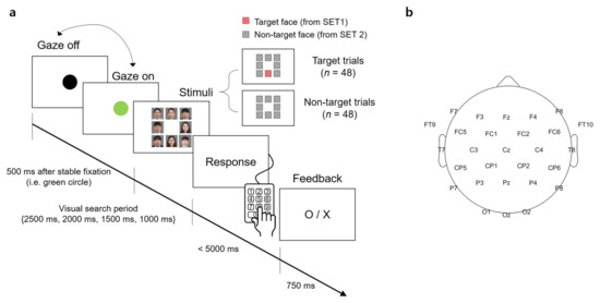 Many event-related potential (ERP) studies have investigated neural activity during face recognition in order to understand attentional processes related to the rapid processing of facial information [5,6,7,8,9]. The ERP results have suggested that our attention is attracted more by familiar faces compared to unfamiliar ones due to emotional significance. For example, the faces of relatives, friends, and romantic partners induced greater positivity of ERPs over frontal to occipital midline areas than celebrities or strangers did [6,7,8]. Another study found a difference in ERPs between acquaintances’ faces and newly-learned faces [5]. This study employed the oddball paradigm with strangers’ faces as frequent and acquaintance or newly-learned faces as infrequent stimuli. It showed a slower P300 latency in response to newly-learned faces than that in response to faces of acquaintances. It implies that the recognition of newly-learned faces is more cognitively demanding than that of familiar faces. Yet, this study, as well as previous ERP studies, adopted a stimulus-response paradigm with passive viewing where subjects were shown a series of face stimuli so that their attention was largely driven by the intrinsic properties of faces. Therefore, it is still not clear how familiarity modulates goal-directed attention towards faces. To address this question, other types of paradigms, such as a visual search task, may help us find the effect of familiarity on goal-directed attention towards a target face.