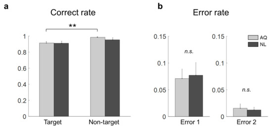 Without the 1 s period block, we compared the correct rates of target and non-target trials of the AQ and NL groups. Two-way mixed rmANOVA revealed the significant main effect of target presence ( = 12.36, p = 0.002, ), but not of familiarity ( = 0.56, p = 0.46), on the correct rate. No interaction effect was found ( = 0.73, p = 0.41). As shown in Figure 2a, the correct rate for the non-target trials (0.98 ± 0.01) was significantly higher than that for the target trials (0.91 ± 0.02) in the AQ group ( = 0.007). No difference was found between the AQ and NL groups with respect to both Error 1 ( = −0.21, p = 0.84) and Error 2 ( = 0.32, p = 0.24).