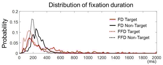 The fixation duration was defined in this study as the time elapsed from the first entry on an AOI to the first exit out of that AOI. Yet, there could be more than one fixation in an AOI. Hence, we examined fixations within the target face in the target trials or within the longest-dwelled non-target face in the non-target trials to see if there were more than one fixation in the AOIs. We found that the number of target trials with more than one fixation was 3.87 ± 2.45 out of 36, and the number of non-target trials with more than one fixation was 6.25 ± 4.37 out of 36. Many of these trials were not rejected by peak amplitudes (see Section 2.6). Note that the number of accepted target trials with a single fixation was 25.19 ± 3.99 and that of non-target trials was 27.00 ± 3.94. We also compared the distribution of all the fixation durations and that of the first fixation durations (in case more than one fixation existed) for both the target and non-target trials, respectively (Figure 3). We observed that the cumulative distribution function of the first fixation durations was larger than that of all fixation durations, for both the target and non-target trials, indicating that the first fixation durations were statistically shorter (two samples Kolmogorov–Smirnov test, k = 0.30 for target and k = 0.37 for non-target trials, p < 0.0001). This implies that the later components of EFRPs on the first fixation might include the early components of EFRPs based on the subsequent fixation. There were, however, only a few accepted epochs with multiple fixations for the EFRP analysis (3.87 ± 2.45 for the target trials and 6.25 ± 4.37 for the non-target trials). In brief, although the first fixations exhibited relatively shorter durations than pre-defined fixations in Section 2.5, calculated EFRPs included only a few trials with such multiple fixations, in addition to much more trials with a single fixation on the AOIs.
