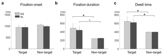 Eye-tracking results of the target face detection task. (a) Fixation onset, (b) fixation duration, and (c) dwell time on the target faces (Target) or non-target faces with the longest fixation (Non-garget) for the AQ (Acquaintances faces) and NL (Newly-learned) groups. The stars indicate the significance from a multiple comparison test: Black stars denote < 0.05 and a gray one denotes < 0.1.