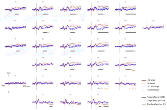 Approximately 200 ms after fixation onset, the target faces elicited significantly enhanced positivity for both AQ and NL groups over widely distributed channels, including: F7, F3, Fz, F4, F8, FC5, FC1, FC2, FC6, T7, C3, Cz, C4, T8, CP5, CP1, CP2, and CP6 (Figure 6a). This positive deflection was considered as the P300 component. Then, we obtained the mean P300 amplitude by calculating the time-average of amplitude within a window of 200–400 ms post-stimulus for each channel. These mean P300 amplitude values were averaged again across the 17 channels selected above. Lastly, we statistically analyzed the effect of target presence and familiarity on this averaged P300 amplitude. Two-way mixed rmANOVA revealed the main effect of target presence ( = 10.72, p = 0.005, = 0.43) on the P300 amplitude. Multiple comparison with Bonferroni correction showed a larger P300 amplitude for the target faces than for the non-target faces in both AQ and NL groups ( = 0.043 and = 0.031, respectively) (Figure 6b). Neither main effect of familiarity (p = 0.77) nor interaction effect (p = 0.90) was found.