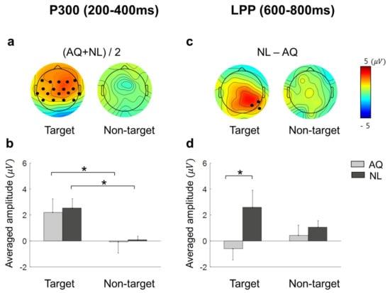 The scalp distributions and the mean amplitude of EFRPs: P300 and late positive potential (LPP). (a) Scalp distributions for the target and non-target trials of the average of AQ (Acquaintances faces) and NL (Newly-learned). Black dots indicate the channels where a significant main effect of target presence was found resulting from two-way mixed rmANOVA on P300. (b) Mean amplitude of the channels indicated in (a). (c) Scalp distributions for the difference between AQ and NL group of target and non-target trials. Black dots indicate the channels where a significant main effect of group resulting from two-way mixed rmANOVA on LPP. (d) Mean amplitude of the channels indicated in (c). A star in the bar plots represents < 0.05.