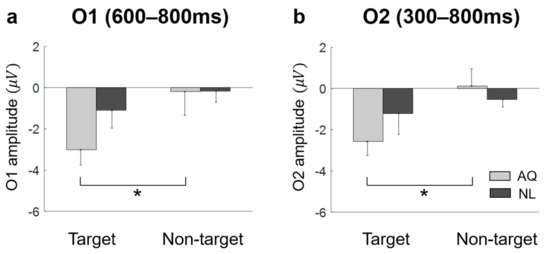 The amplitude at bilateral occipital area. (a) AQ (Acquaintances faces) group had significantly negative value in target trials then non-target trials at O1 during 600–800 ms. (b) at O2 during 300–800 ms. A star represents < 0.05.