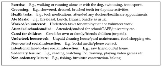 The SIAD contains twelve common daily activities, see Figure 1. These included basic activities necessary for independent living (e.g., grooming, eating meals, etc.) used for assessing activities of daily living in the elderly [18]. These basic activities were expanded to include common activities of adults across the whole age range (e.g., work/volunteering/education, care for children, exercise, leisure activities). Each activity engaged in scored 1, with a maximum sum of 12. Additionally, for each of the 12 activities in which they participated they reported: (1) How their sleep on the previous night negatively affected their ability to participate (responses ranging from: 0 = ‘not at all’ to 4 = ‘a great deal’), and (2) how much effort it took to participate in the activity (responses ranging from: 0 = ‘no effort’, up to 4 = ‘extreme effort’). In cases where participants had completed the same activity multiple times throughout the day, they indicated the average amount of impact of their sleep and their effort for that activity. This resulted in a single sleep impact and effort value for each activity on each day. Activities that participants did not participate in each day were indicated by reporting ‘N/A’ and not scored.