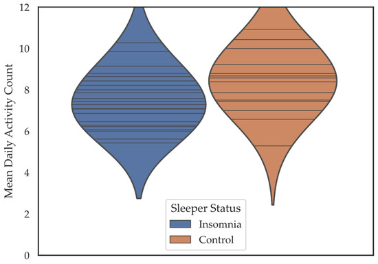 Violin plots depicting the mean daily activity participation count for individuals in the insomnia and control groups. Horizontal lines are individual data points. Colored regions are the Gaussian kernel density estimates (KDE) with bandwidth equal to one standard deviation of the data.