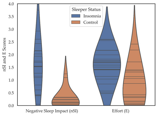Violin plots depicting the negative sleep impact (nSI) and effort (E) scores including all 12 SIAD items over 14- days for individuals in the insomnia and control groups. Horizontal lines are individual data points. Colored regions are the Gaussian kernel density estimates (KDE) with bandwidth equal to one standard deviation of the data.