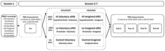 The primary outcome measure was TMS-induced motor evoked potentials (MEPs) of the tibialis anterior (TA) muscle; this was assessed with single-pulse TMS during a 10% maximal voluntary contraction (MVC) of the dorsiflexor muscles to provide an indication of CME []. MEPs were recorded pre-intervention and at 0, 15, 30, and 45 min post-intervention. TMS procedures were replicated at each of the six sessions as per the International Federation of Clinical Neurophysiology (IFCN) guidelines [].