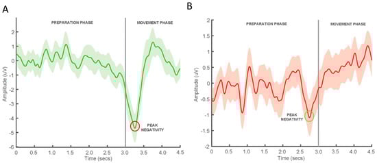 Average MRCPs with 95% confidence intervals obtained from one participant (A) performing voluntary ankle dorsiflexion and (B) performing imagined ankle dorsiflexion. The vertical line at the 3-s mark corresponds to the visual cue to move.
