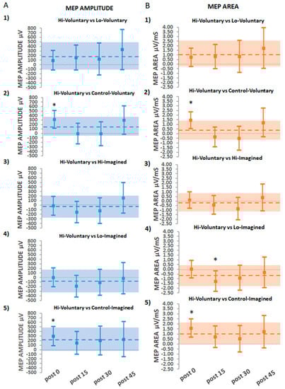 Estimated adjusted effect differences in absolute units between Hi-Voluntary and each intervention on (A) MEP amplitude and (B) MEP area, at each post-intervention time point and averaged over time. Error bars depict 95% CIs. Dashed lines depict estimates averaged over time with a shaded bar for 95% CIs; * indicates significant effects (p < 0.05).