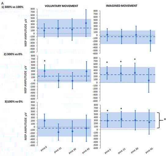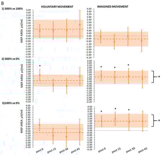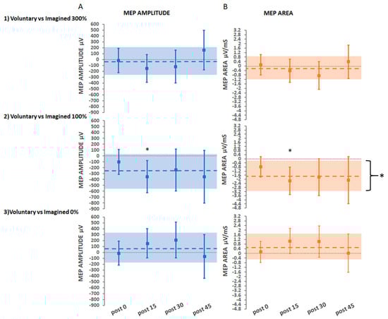 Estimated adjusted effect differences between voluntary and imagined movement at each stimulation intensity level on (A) MEP amplitude and (B) MEP area, at each post-intervention time-point and averaged over time. Error bars depict 95% CIs. Dashed lines depict averaged over time estimates with a shaded bar for 95% CIs; * indicates significant effects (p < 0.05).