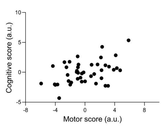 A further insight from the present study regards the mutual relationship between cognitive and motor neural networks [38,39]. Although speculative, the association found in the current study may be partly explained by shared underlying neural processes involved in motor and cognitive tasks. In this regard, Diamond proposed the notion of synchronous activation of the cerebellum and prefrontal cortex in both motor and cognitive tasks to explain the relationship between the motor and the cognitive domains [40]. Consequently, these structural and functional links between neural networks underpinning cognitive and motor tasks might contribute to explain—at least partially—the positive association between the two cumulated scores.