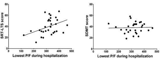 Bivariate analysis results (Table 3) revealed a positive correlation between the lowest P/F ratio during hospitalization and verbal memory consolidation performance (SRT-LTS score, r = 0.404, p = 0.027), while there was no significant correlation between the lowest P/F ratio and other BRB-NT subtests (Figure 1). SpO2 levels upon hospital arrival were positively correlated with delayed verbal recall performance (SRT-D score, rs = 0.373, p = 0.042), but not with other BRB-NT subtests. No significant correlation was found between viral clearance time and BRB-NT subtest scores. BDI-II scores correlated negatively with delayed verbal recall performance (SRT-D scores, rs = −0.372, p = 0.023), but not with other BRB-NT subtests.