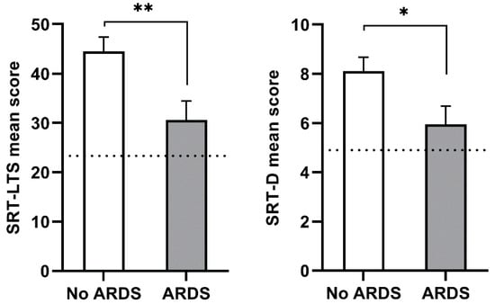Verbal memory in patients with acute respiratory distress syndrome (ARDS) and without (no ARDS). Left: Serial Recall Test Long-Term Storage (SRT-LTS); right: Serial Recall Test Delayed Recall (SRT-D). Data are presented as a mean score with standard error. The dotted line indicates normative cutoff scores for the SRT-LTS (cutoff ≥ 23.3) and SRT-D (cutoff ≥ 4.9) subtests. Asterisks denote statistical significance (* = p < 0.05; ** = p < 0.01).
