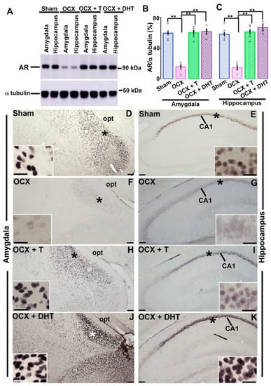 Androgen receptor (AR)-immunoreactivity in the amygdala and hippocampus of the sham-operated and steroid-manipulated male rats. (A) AR-immunoreactivity in the amygdaloid and hippocampal area were analyzed by Western blotting. (B,C) Total AR-immunoreactivity was normalized to α-tubulin. Values are the mean ± SEM. **p < 0.001. n = 6 for each group. White rectangles in (B,C) represent data points. (D–K) Photomicrographs showing the AR expression in the amygdala (D,F,H,J) and hippocampus (E,G,I,K) of steroid manipulated rats. Insets are the enlargements of * in (D–K), respectively. Scale bar = 100 μm in (D–K) and 20 μm in insets. opt, optic tract.
