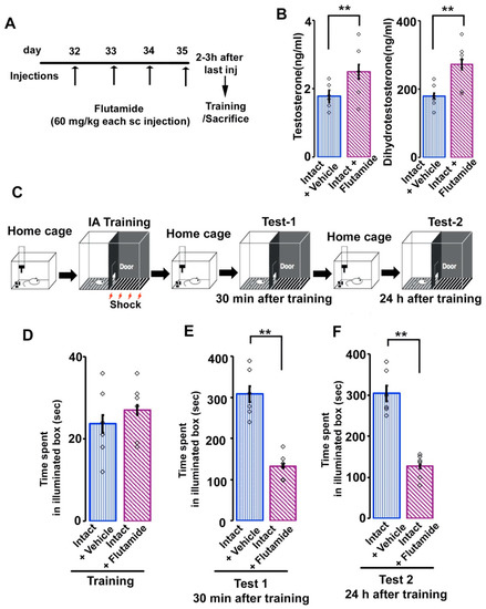 Time spent in illuminated box before entering the dark side of the box in vehicle and flutamide-injected male rats. (A) Schematic diagram of the schedule for flutamide injections. (B) Serum testosterone (T) and dihydrotestosterone (DHT) concentra-tion. n = 18 for each group. (C) Diagram of experimental design of inhibitory avoidance task. Rats were housed in a home cage but moved into the light box used for the task on the training day. A brief electrical foot-shock (2 s) was applied in the dark box in the shock cage. (D) time spent in illuminated box before training, (E) 30 minutes after training or (F) 24 h after training of vehicle and flutamide-treated intact rats. Values are the mean ± SEM. **p < 0.001. n = 6 for each group. White rectangles in (B), (D–F) represent data points.