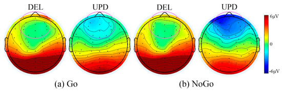 Heat maps between DEL and UPD groups on baseline Go/NoGo task. Here, a symmetrical color bar is used. The red indicates activity with positive amplitude, the blue indicates negative amplitude, and the green indicates activity with zero value. Range = +/− 6 microvolts. The channels used in ERP analysis are highlighted (t = 245ms). (a) Go condition when viewing non-food images. (b) NoGo condition when viewing food images.