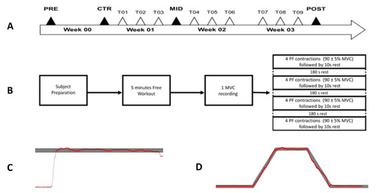 Four evaluation sessions were performed throughout the experiment. Two evaluation sessions (PRE and CTR) were conducted a week apart before the first training session. A mid-term evaluation session (MID) was realized after one week of training, and the final evaluation session (POST) was performed at the end of the training. A 48 h rest was respected between each evaluation session and the preceding or following training session.
