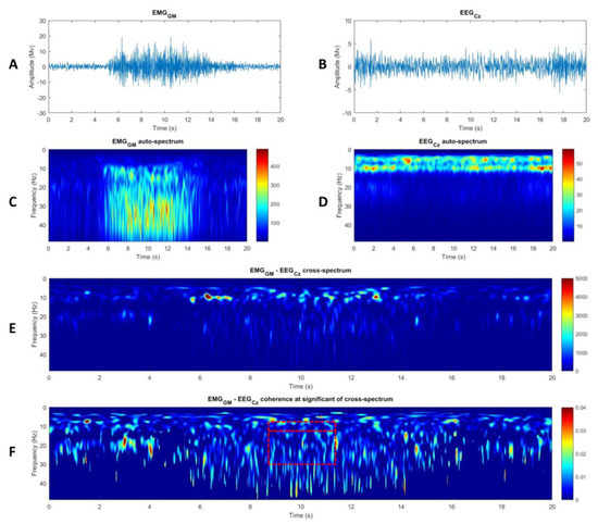 After appropriate preprocessing, the auto-spectrum of each EMG (Figure 2A,C) and Cz EEG (Figure 2D) signal and the cross-spectrum between each EMG and Cz EEG signal (Figure 2E) were quantified in the time–frequency domain using the WavCrossSpec Matlab toolbox for wavelet coherence analysis [38,39]. Wave number was set at 7 with frequency ranging from 0.05 Hz to 48.61 Hz in 0.45 Hz step. The magnitude of the CMC between Cz EEG and each EMG signal was quantified using the following equation: