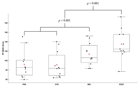 Average torque during MVIC in plantarflexion (N.m) according to the evaluation session (PRE, CTR, MID, POST sessions). Each whiskers box indicates the mean (red circle) and the median (horizontal line). The inferior edge and superior edges of the box indicate the 25th and 75th percentile, respectively. Error bars represent the most extreme and non-outlier data points. Black dots represent individual participant performance.