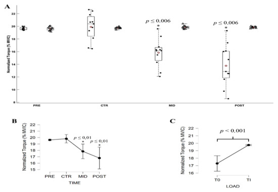 A two-way repeated-measures ANOVA on Evaluation time (PRE, CTR, MID, POST) × Torque level (T0, Ti) was conducted on the normalized net torque, EMGTS, and the magnitude of CMC. Equivalent non-parametric Friedman ANOVA on (4 Evaluation time × 2 Torque level) was conducted independently on the EMGTA, AE, VE, and net torque recording over HFP. Huynh-Feldt correction for degree of freedom was used where applicable and ε values are reported. If a significant effect was found, non-directional paired t-tests (or equivalent non-parametric Conover’s post hoc tests) were used to compare each factor. Cohen’s d was reported where applicable. The significance level was set at p = 0.05 and Bonferonni-Dunn correction was applied where applicable.