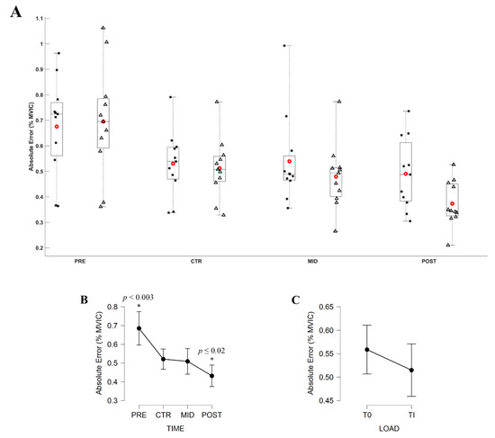 (A) Absolute Error (AE; % MVIC) during submaximal contractions computed according to the torque levels, T0 (black square) and Ti (white triangle), and evaluation sessions (PRE, CTR, MID, POST sessions). Each whiskers box indicates the mean (red circle) and the median (horizontal line). The inferior and superior edges of the box indicate the 25th and 75th percentile, respectively. Black dots represent individual participant performance. (B) AE during submaximal contractions computed according to evaluation sessions and (C) to the torque levels. Error bars represent the most extreme and non-outlier data points (A) and 95% confidence intervals (B,C). * significantly different from all other conditions.