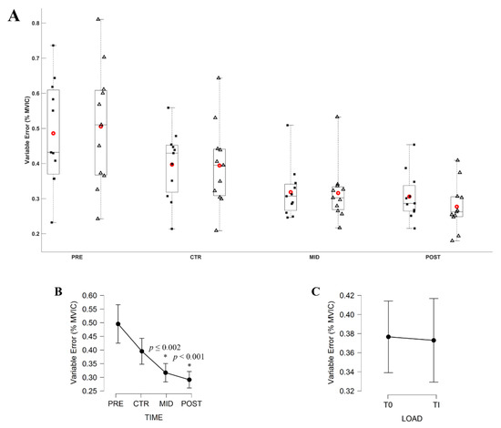 (A) Variable Error (VE; % MVIC) during submaximal contractions computed according to the torque levels, T0 (black square) and Ti (white triangle), and evaluation sessions (PRE, CTR, MID, POST sessions). Each whiskers box indicates the mean (red circle) and the median (horizontal line). The inferior and superior edges of the box indicate the 25th and 75th percentile, respectively. Black dots represent individual participant performance. (B) VE during submaximal contractions computed according to evaluation sessions and (C) to the torque levels. Error bars represent the most extreme and non-outlier data points (A) and 95% confidence intervals (B,C). * Significantly different from PRE and CTR evaluation.