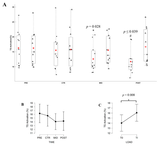 (A) Average EMGTS during submaximal contractions computed according to the torque levels, T0 (black square) and Ti (white triangle), and evaluation sessions (PRE, CTR, MID, POST sessions). Each whiskers box indicates the mean (red circle) and the median (horizontal line). The inferior and superior edges of the box indicate the 25th and 75th percentile, respectively. Black dots represent individual participant performance. (B) Average EMGTS during submaximal contractions computed according to evaluation sessions and (C) to the torque levels. Error bars represent the most extreme and non-outlier data points (A) and 95% confidence intervals (B,C). * Significant difference in comparison to Ti torque level recording at MID evaluation. # significant difference in comparison to T0 and Ti torque level respectively recorded at PRE and POST evaluation.