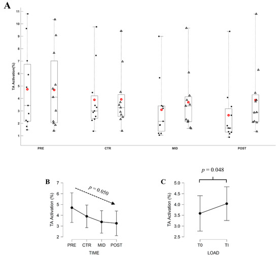 (A) Average EMGTA during submaximal contractions computed according to the torque levels, T0 (black square) and Ti (white triangle), and evaluation sessions (PRE, CTR, MID, POST sessions). Each whiskers box indicates the mean (red circle) and the median (horizontal line). The inferior and superior edges of the box indicate the 25th and 75th percentile, respectively. Black dots represent individual participant performance. (B) Average EMGTA during submaximal contractions computed according to evaluation sessions and (C) to the torque levels. Error bars represent the most extreme and non-outlier data points (A) and 95% confidence intervals (B,C).