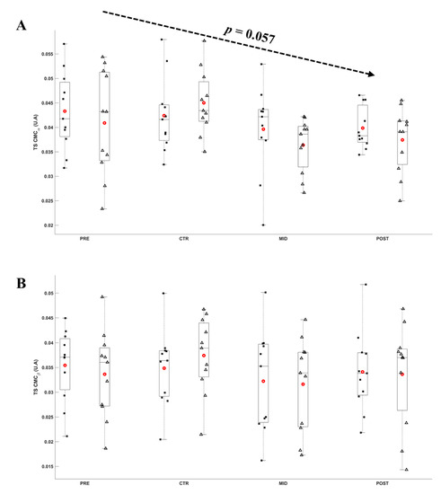 The Friedman ANOVA revealed a significant effect of Evaluation time (X2 = 7.831; df = 3; p = 0.050) and Torque level (X2= 3.896; df = 1; p = 0.048) on the EMGTA. Connover’s post hoc test revealed no significant difference in between evaluations (all |t10| ranging from 0.001 to 2.483, p ≥ 0.092). EMGTA computed over T0 decreased from 4.73 ± 1.92%, 3.89 ± 1.48%, 3.08 ± 1.41%, to 2.65 ± 1.44%, respectively for PRE, CTR, MID, and POST evaluations. EMGTA at Ti averaged 4.68 ± 1.83%, 3.92 ± 1.37%, 3.69 ± 1.41%, and 3.87 ± 1.58%, respectively, for PRE, CTR, MID, and POST evaluations. Figure 7 and Figure 8 depict, respectively, the EMGTS and EMGTA throughout evaluations.
