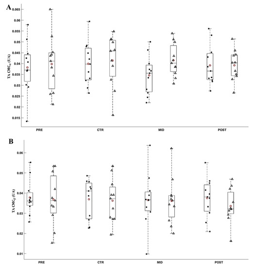 Average α (A) and ß (B) CMCTS during submaximal contractions computed according to the torque levels, T0 (black square) and Ti (white triangle), and evaluation sessions (PRE, CTR, MID, POST sessions). Each whiskers box indicates the mean (red circle) and the median (horizontal line). The inferior and superior edges of the box indicate the 25th and 75th percentile, respectively. Black dots represent individual participant performance. Error bars represent the most extreme and non-outlier data points.