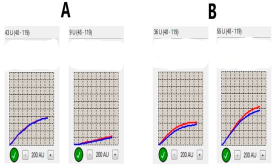 Dynamics of platelet reactivity over time. (A) Sample of favorable dynamics of platelet reactivity (defined as a decrease over time at least 5 U- area under the curve units). (Left) Normal baseline value of platelet reactivity (43 U). (Right) Decrease in value of platelet reactivity 48 h later to 9 U; the difference between both measurements is 34 U, which meets the adopted criteria of favorable dynamics. (B) Sample of unfavorable dynamics of platelet reactivity. (Left) Normal baseline value of platelet reactivity (36 U). (Right) Increase in value of platelet reactivity 48 h later to 55 U. The reported increase over time is considered as unfavorable change over time and reflects clopidogrel nonresponsiveness. The final value of platelet reactivity given as U is the average between values obtained in two pairs of electrodes (marked as red and blue lines).