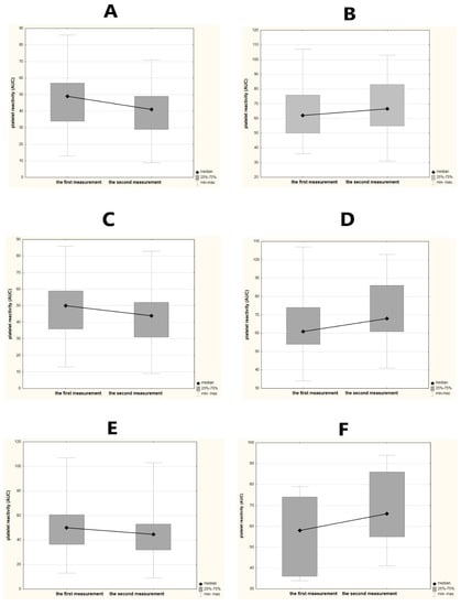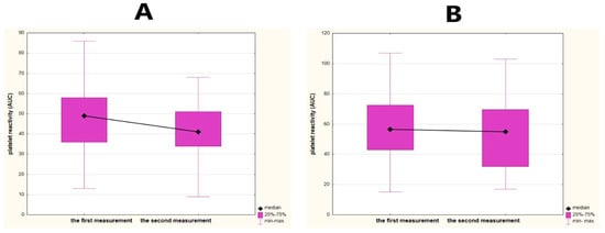 Analysis of platelet function was performed by impedance aggregometry in the Laboratory of Experimental Biotechnology at Collegium Medicum in Bydgoszcz. Two blood samples, collected from the veins of the forearm, were used for platelet function testing. The first measurement was 6–12 h after the initial dose of clopidogrel. The second measurement of platelet aggregation was assessed 48 h later (±4 h). An adenosine diphosphate (ADP) test was applied in this study, where ADP was used as an activator of platelets in the Multiplate–Dynabyte multichannel platelet function analyzer (Roche Diagnostics, France). The addition of a platelet agonist to the solution activates them, forcing them toward the two electrodes, which is then perceived by the control system as a change in resistance (impedance). Next, automatic conversion of these signals is performed through graphical visualization as an area under the curve (AUC). The average for two electrode pairs was considered as the final result of the platelet function assessment. We adopted values over 46 AUC as the cutoff point, corresponding to high platelet reactivity on treatment, reflecting an insufficient inhibitory effect on platelets by clopidogrel. Similar values were used in other studies [,]. The processing steps of platelet function testing were consistent with those reported by other investigators []. The dynamics of platelet reactivity over time was assessed as the difference between values obtained in two measurements. A decrease in platelet reactivity equal to or higher than the median value obtained in this study (5AUC) was considered as a favorable change in platelet function. Any other observed dynamics were taken into account as an unfavorable change. Samples of favorable and unfavorable dynamics of platelet function are presented in Figure 1. Statistical calculations were used to highlight the significance of the dynamics of platelet reactivity over time.