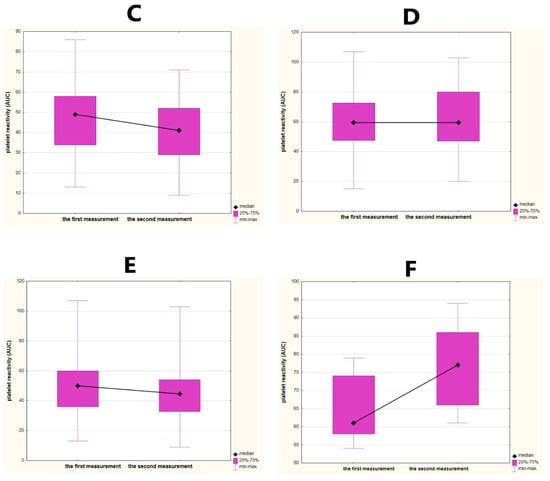 Dynamics of platelet reactivity over time in relation to the severity of stroke. The dynamics of platelet reactivity is the difference between two measurements of platelet reactivity over time (48 h). We defined a favorable change as a decrease over time at least 5 AUC (area under the curve units). Any increase over time or a decrease less than 5 AUC was defined as an unfavorable change. (A) A significant and favorable dynamics of platelet reactivity in stroke subjects with mild early stroke severity—the National Institutes of Health Stroke Scale (NIHSS) 0–5 on admission. (B) An unfavorable dynamics of platelet reactivity in stroke subjects with severe early clinical condition—NIHSS 6 and over on admission. (C) A significant and favorable dynamics of platelet reactivity in stroke subjects with mild late stroke severity—NIHSS 0–5 on 90th day. (D) An unfavorable dynamics of platelet reactivity in stroke subjects with a severe late clinical condition—NIHSS 6 and over on 90th day. (E) A significant and favorable dynamics of platelet reactivity in stroke subjects without early deterioration in clinical condition—no reported increase in total scores on the NIHSS between the third and first days. (F) An unfavorable dynamics of platelet reactivity in stroke subjects with early deterioration in clinical condition—increase in total scores on the NIHSS of at least 1 point between the third and first days.