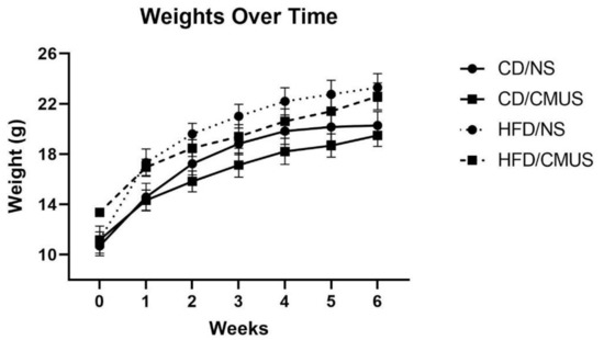 Diets were purchased through Research Diets Inc. (New Brunswick, NJ, USA). Animals received either a high-fat diet (HFD) (D12492 Rodent Diet with 60 kcal% fat) or a control diet (CD) (D12450J Rodent Diet with 10 kcal% fat; matching sucrose to D12492) starting at PND 28 and continued until the completion of the study. The animals were weighed weekly throughout the progression of the study to keep track of weight changes. Food intake was also measured throughout the duration of the study; particularly, during the four weeks of CMUS administration. However, due to group housing, average intake per mouse was calculated as: [((g) food consumed after one week)/Number of animals in the cage]. The animals received ad libitum access to food and water.