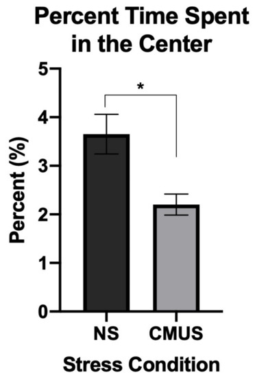 Percent time spent in the center of the open field test (OFT). Mice undergoing CMUS spent significantly less time in the center of the OF compared to NS mice (NS) (* p < 0.05; p = 0.01).