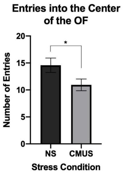 Number of entries into the center of the OFT. Mice undergoing CMUS made significantly fewer entries into the center of the OFT as compared to NS mice (* p < 0.05).