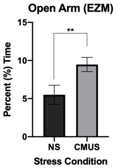 Percent time spent in the open arms of the elevated zero maze (EZM). Mice undergoing CMUS spent significantly more time in the open arms of the EZM compared to those in the NS condition (** p < 0.01).
